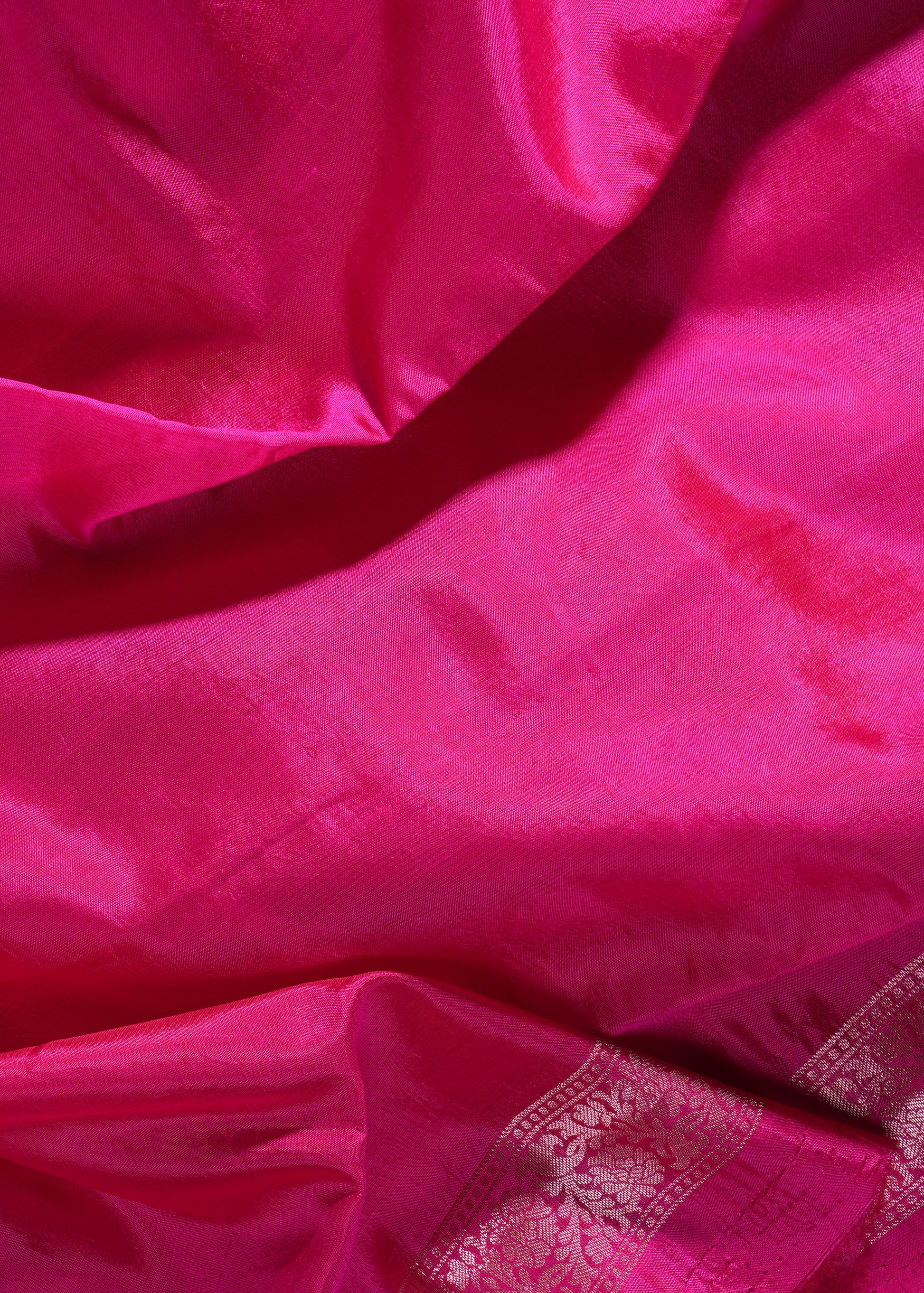 Radiant Rani Pink Banarasi Silk Saree with Intricate Silver Zari Buta Work